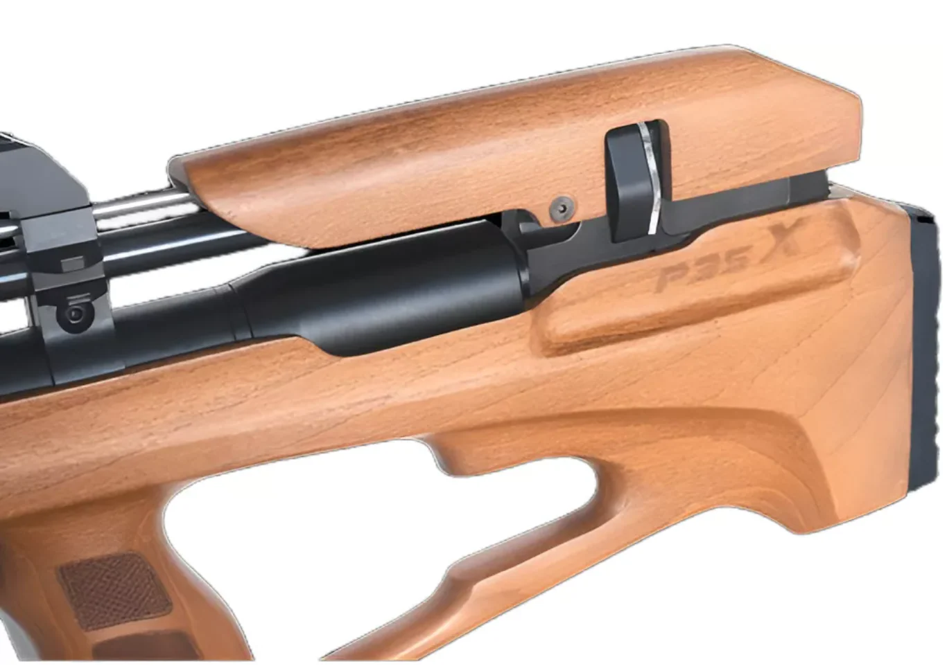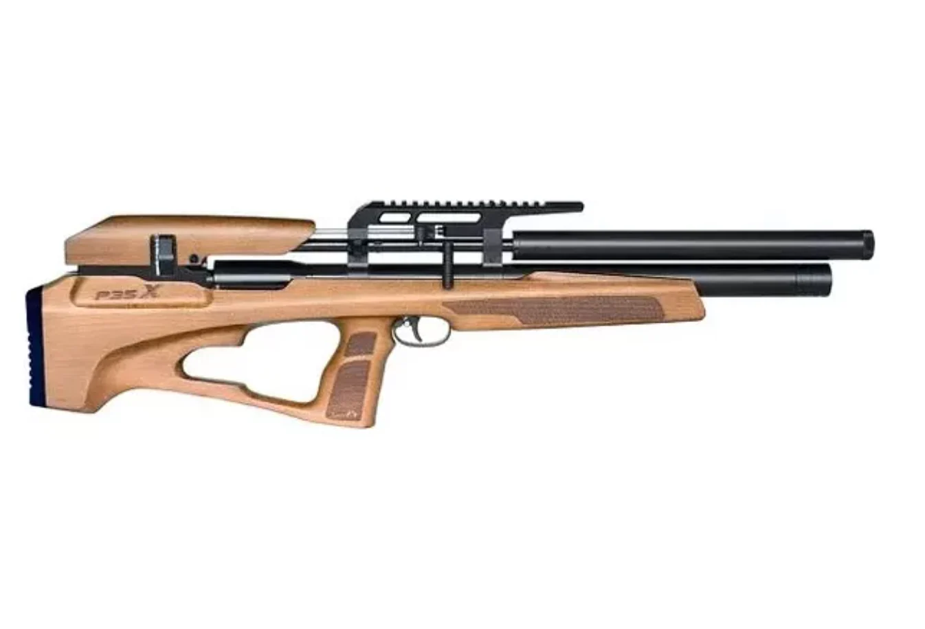 Rifle Artemis P35X PCP con culata de madera que dispone de armado con palanca lateral ambidiestra y disparo multitiro con cargador giratorio para 9 postones. Equipado con cilindro de 280 cc, 250 bar de presión, sistema Power Plenum de 65 cc, 60 disparos por carga completa, manómetro, umbral engomado, reposacabezas fijo de madera, riel picatinny de 21 mm, supresor integrado, gatillo ajustable, válvula de seguridad manual con bloqueo y válvula reguladora. . Alcanza una velocidad de 302 m/s (1000 fps) APROX. en calibre 5,5 mm